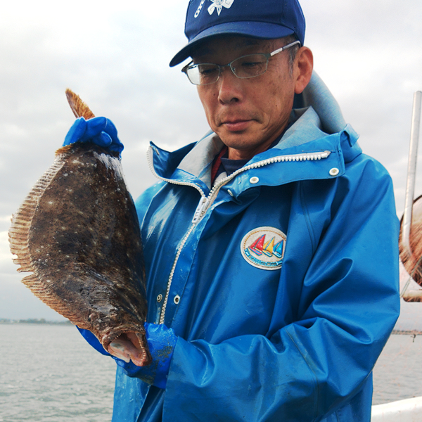 ヒラメ刺し網の投入見学、網揚げ作業の見学、及び網にかかったヒラメの取り外し、イケスへの投入